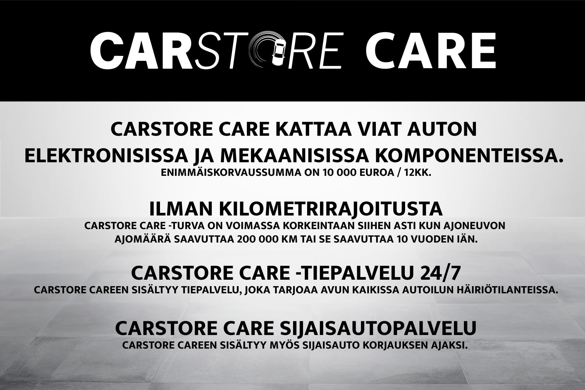 - Tähän autoon on saatavilla Carstore Care lisäturva 12 kk tai 24 kk. Carstore Care lisäturva on voimassa siihen asti kun auto saavuttaa 200 000km tai se saavuttaa 10 vuoden iän.