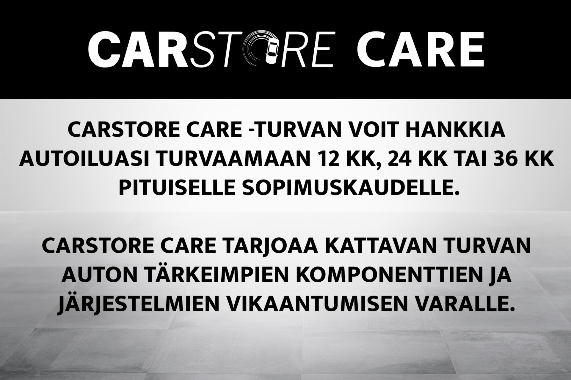 - Tähän autoon on saatavilla Carstore Care lisäturva 12 kk, 24 kk tai jopa 36 kk. Carstore Care lisäturva on voimassa siihen asti kun auto saavuttaa 300 000 km tai se saavuttaa 20 vuoden iän, tai sopimusaika päättyy.