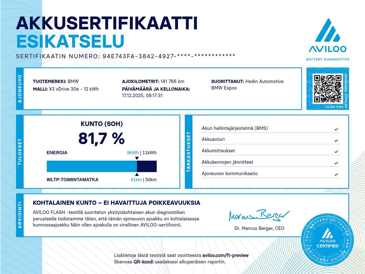 - Akun kapasiteetin mittaavan SOH-testin tulos 81,7% - lisätietoja saat myyjältä
