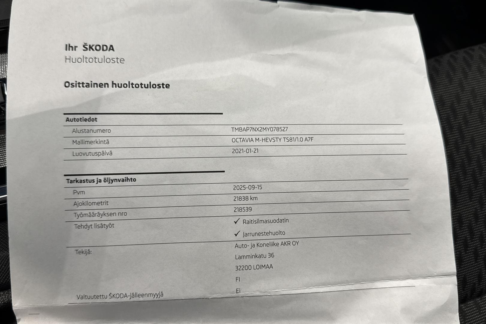 - Viimeisin huolto tehty: 9/2025 21 tkm kohdalla